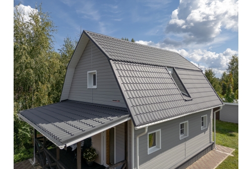 - В отличие от облицовки фасада деревом, металлический сайдинг «ЭкоБрус GL» прост в монтаже и не требует дополнительного послемонтажного ухода.