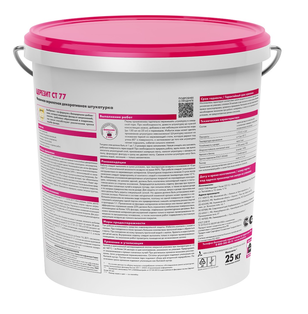 Декоративная штукатурка CT 77 предназначена для изготовления тонкослойных декоративных покрытий с «мозаичной» фактурой на бетоне, цементных и гипсовых штукатурках, гипсокартоне, древесностружечных плитах и т.д. внутри и снаружи зданий.